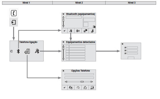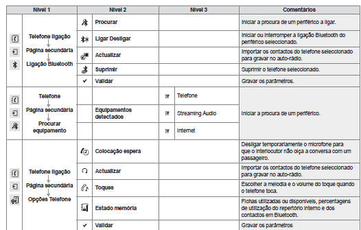 | O som do telefone ligado por Bluetooth é inaudível. | O som depende do sistema e do telefone | Aumente o volume do auto-rádio, eventualmente até ao máximo e aumente o som do telefone se necessário. |