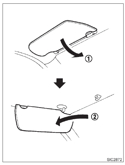 Para bloquear qualquer ofuscamento proveniente da parte lateral, desencaixe o para-sol de sua fixação central e mova-o para o lado 2.
